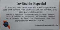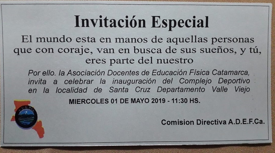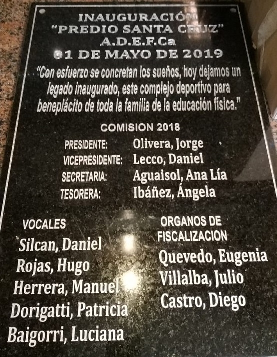 En la oportunidad se descubrirá una placa recordatoria en referencia a la “Inauguración del Predio Santa Cruz” de ADEFCa., con esta frase evocativa: “Con esfuerzo se concretan los sueños, hoy dejamos un legado inaugurando este complejo deportivo, para beneplácito de toda la familia de la educación física”.