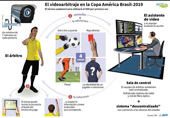 La Copa América que se celebra en Brasil del 14 de junio al 7 de julio servirá de banco de pruebas para los cambios en el reglamento del fútbol que entraron en vigor el pasado primero de junio y se utilizará por primera vez el VAR en el torneo sudamericano.