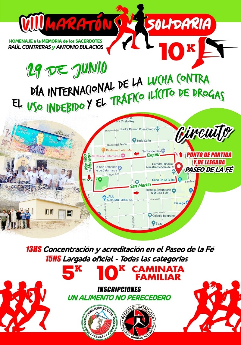 A través del Proyecto Institucional entre la Policía de Catamarca y la familia del Atletismo, “Súmate a la Vida que en Equipo Ganaremos”, esta jornada será de carácter solidario; por lo que los participantes estarán colaborando con dos Instituciones de bien público que trabajan en la prevención y contención de adicciones, como lo es “El Hogar de Cristo” y el “Cenáculo” que está Instalado en la Villa de El Rodeo, ambas instituciones con una lucha abierta contra el narcotráfico eran guiadas por los Padres Raúl Contreras y Antonio Bulacio, quienes estaban dedicados de lleno a contener niños y jóvenes que padecían el flagelo de la drogadicción y en lucha abierta contra los narcotraficantes; por designios de Dios, estos dos sacerdotes fallecieron dejando dos grandes obras en pie en la comunidad catamarqueña.