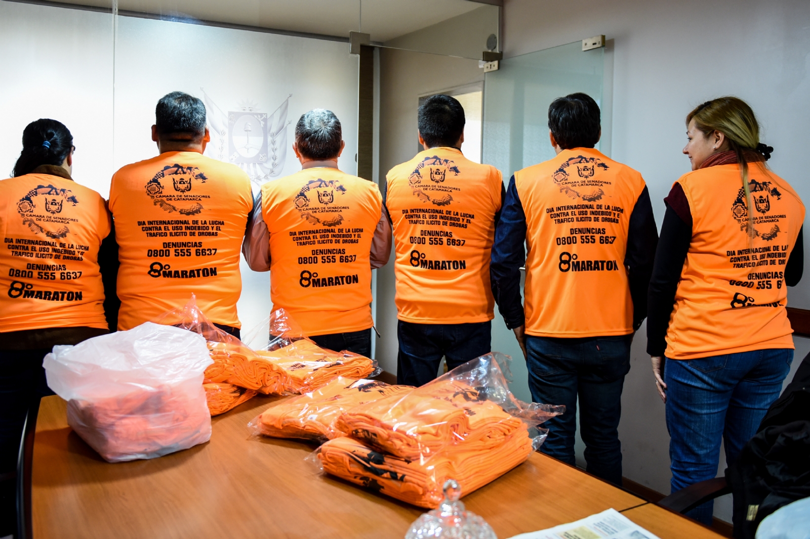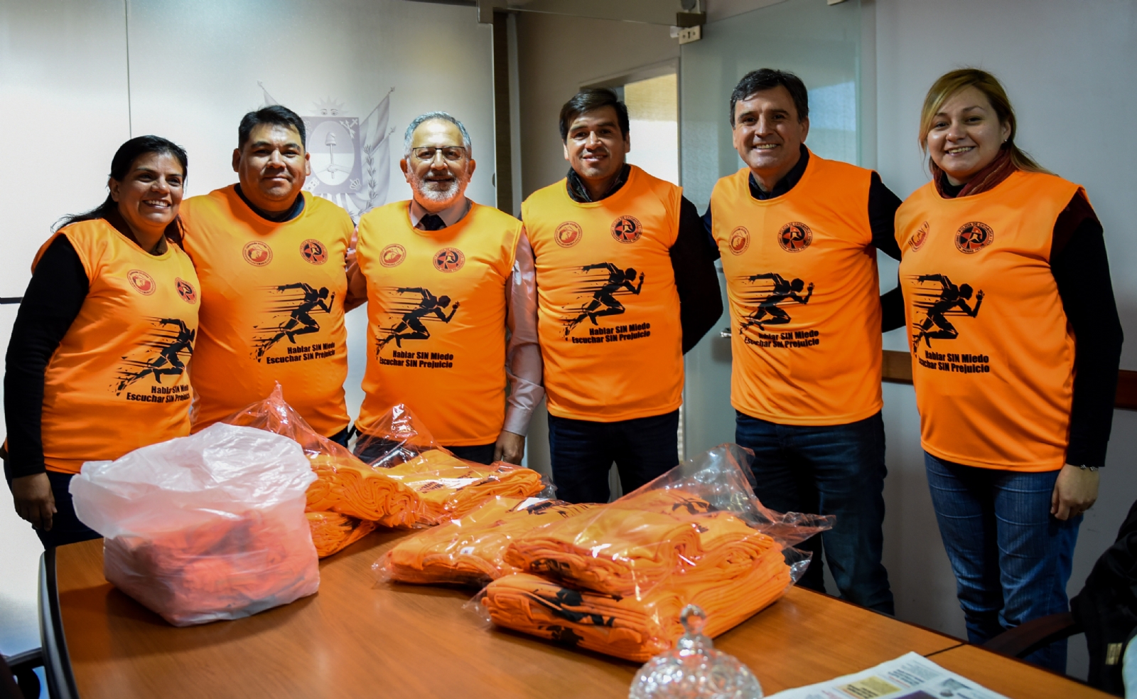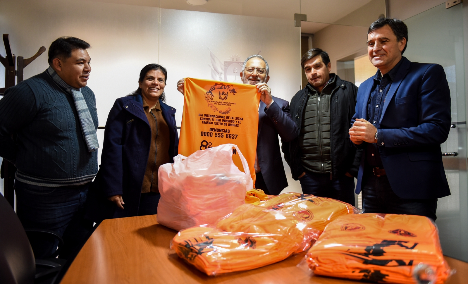 A ellos les hizo entrega de las camisetas que tendrán como destino los participantes de la 8° Corrida Solidaria por el “Día Internacional de la Lucha Contra el Uso Indebido y Tráfico Ilícito de Drogas”, a realizarse mañana sábado 29 de junio, a partir de las 14, desde el Paseo de la Fe.