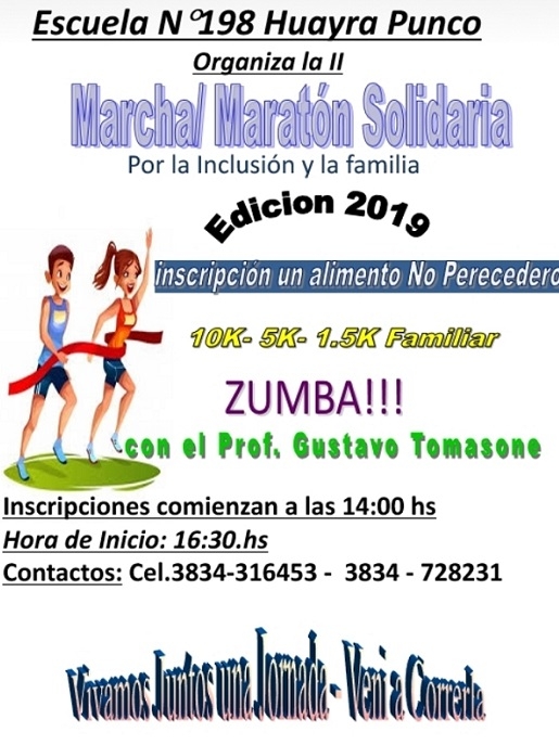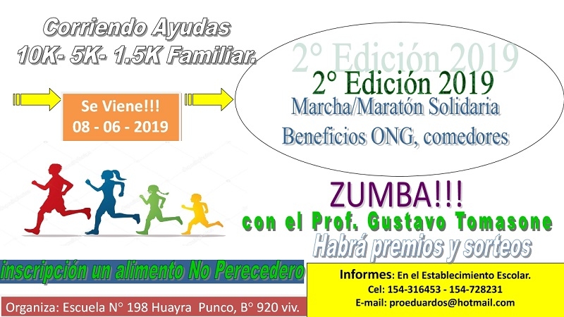 Las inscripciones están previstas a partir de las 13,30 horas, contándose con la primera largada, que será por parte de los marchadores a partir de las 15 horas, sobre las distancias de 5 y 3 km.; en tanto que la largada de la carrera será a las 16 horas en un novedoso circuito que irá desde el Bº 920 VV hasta el dique el Jumeal por Av. Illia, subiendo hasta la primera rotonda de la cuestecilla, con bajada hasta la rotonda del murallón y regreso al local escolar por Av Illia, hasta Felipe Figueroa, luego Av. Galindez, y por esta hasta el ingreso a la calle que da al local escolar.