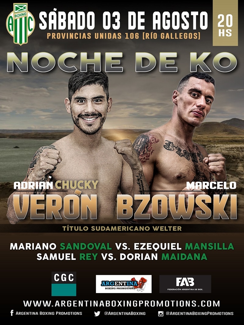 El campeón sudamericano welter, el santacruceño Adrián “Chucky” Verón (aquel de los recordados duelos con Miguel “El Zurdo” Barrionuevo), se enfrentará al férreo bonaerense Marcelo Bzowski, intentando defender por segunda ocasión su corona, en un esperado duelo revancha, en el combate estelar de la velada que se desarrollará este sábado, 3 de agosto, en la Asociación Atlético Boxing Club, sita en Provincias Unidas 106, Río Gallegos, Santa Cruz, Argentina, en una nueva producción de Argentina Boxing Promotions, de Mario Margossian.