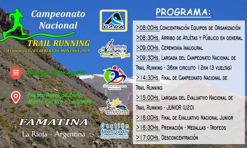Esta cita atlética, a la que concurrirán los más destacados corredores de montaña del país, será este domingo 25, a partir de las 9 hs., en el Puesto Rural de Doña Marta Cerezo, en la Banda, corriéndose 36 km en un circuito de 12 km. que deberá ser transitado en tres oportunidades, en tanto que la categoría U20 lo hará sobre un recorrido único de 7km.