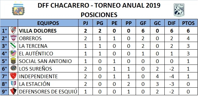 Posiciones: Villa Dolores 6 Pts.; Obreros de San Isidro 4; La Tercena y El Auténtico 3, Social San Antonio, Los Sureños e Independiente 1; La Estación y Defensores de Esquiú 0.