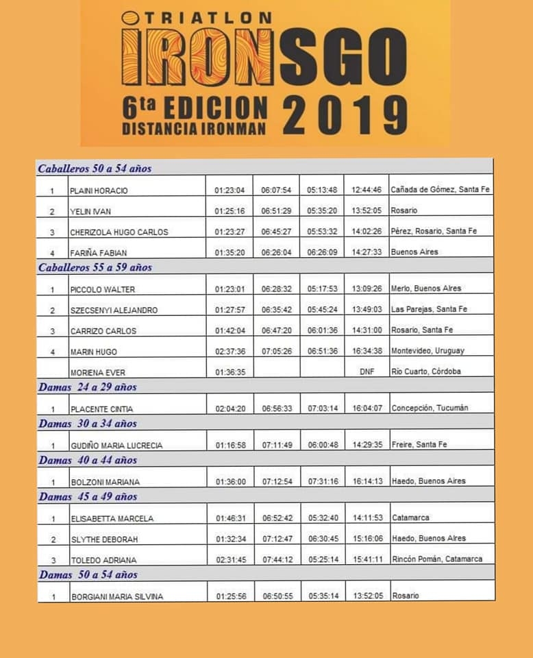 Marcela con un registro 14 horas 11 minutos y 53 segundos pudo descontar los 3,8km de nado en el dique frontal, 180km de ciclismo en la siesta santiagueña para culminar con un Maratón de 42km en una jornada cálida y con poco viento. En la general de mujeres, sólo fue superada por la rosarina María Silvia Borgiani quien con 13:52:05 se impuso también entre las de 50-54. La restante catamarqueña en la grilla y debutante en la distancia, de Rincón, Pomán, la profesora Adriana Toledo acompañó a Elisabetta en el podio de su categoría al terminar 3ª con una marca de 15:41:11. Completó la premiación de esta divisional Deborath Slythe de Haedo, Buenos Aires que fue 2ª.