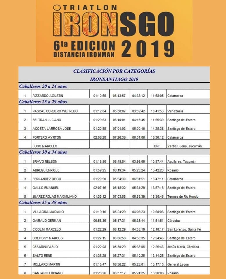 Con un tiempo de 11:58:05, Agustín Rizzardo fue el ganador de la Categoría 20-24 (la de menor edad de la competencia) y el mejor catamarqueño en Santiago del Estero. El santamariano Luis Dioli Funes con un registro de 12:27:57 fue 10º Categoría 40-44 (la de mayor cantidad de concursantes) en la que Nicolás Acosta fue 12º con una marca de 13:32:37. Con un tiempo de 13:47:11 Diego Fernández fue 3º Categoría 30-34 y en 15:36:12 Ayrton Portero terminó 4º en 25-29
