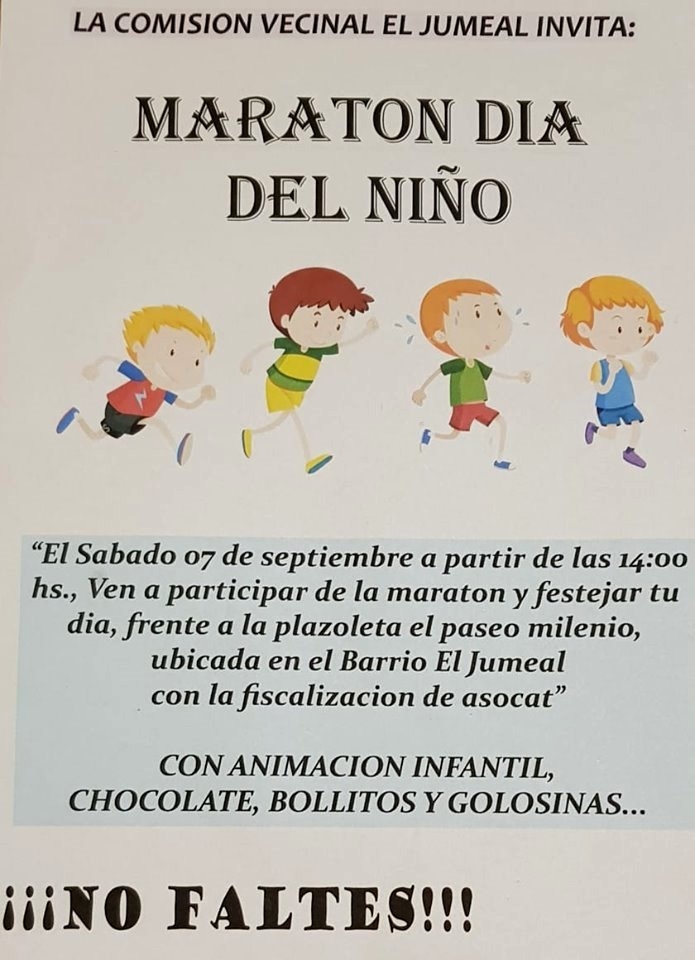 El lugar de concentración, largada y llegada será en calle Monseñor Gavica y Paseo El Milenio. Desde allí, en un circuito de 1200 metros se correrá por las Avenidas Bartolomé de Castro, Juan Pablo Vera y Mariano Moreno, en las distancias de 7.5 y 4 km, en tanto que la marcha atlética lo hará en las distancias de 5 y 3 km; los niños dentro de la mini maratón infantil correrán por calles internas del Barrio, al finalizar la jornada, como en todas las ediciones habrá sorteos, juegos y la infaltable chocolateada final con bollitos.