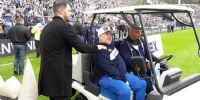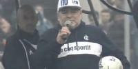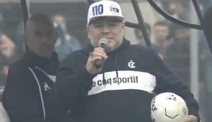 El "olé, olé, olé, olé... Diego, Diego" bajó automáticamente desde las tribunas ni bien se vislumbró la presencia del gigante de 1,65 metro en el campo de juego. Maradona se abrazó con el presidente del club, Gabriel Pellegrino, y se subió al carrito para dirigirse a la mitad de la cancha. Un periplo motorizado que duró segundos, tiempo suficiente para que el conductor saque cual acto de magia una camiseta para que el ídolo le ponga la firma a la casaca y a uno de esos episodios tan únicos como maradonianos.