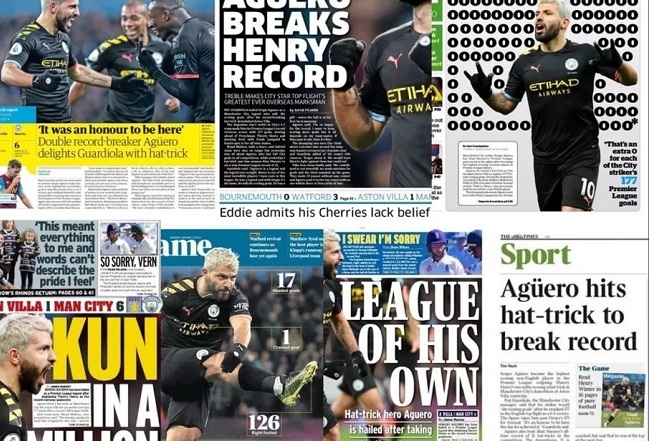 Como era lógico, varios elogiaron su récord, que lo pone ya a la altura de una leyenda, y los medios ingleses se hicieron eco de ese registro. Así, los diarios no dudaron en ubicar a Agüero en sus respectivas portadas.