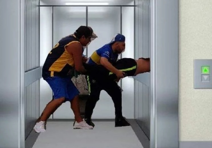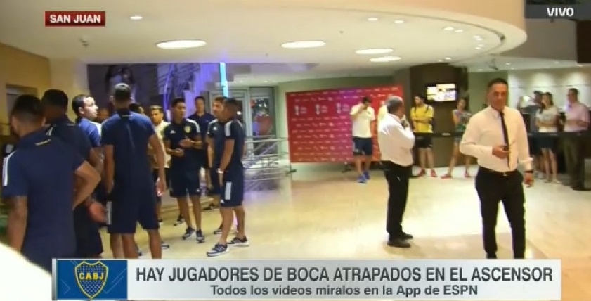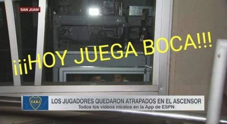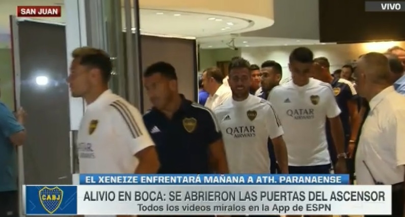 Los que pasaron por el mal momento, mientras subían del subsuelo al hall central, fueron Carlos Tevez, Carlos Izquierdoz, Ramón Abila, Iván Marcone, Paolo Goltz, Junior Alonso, dos kinesiólogos y un empleado de prensa del club.