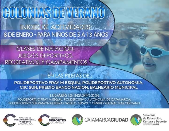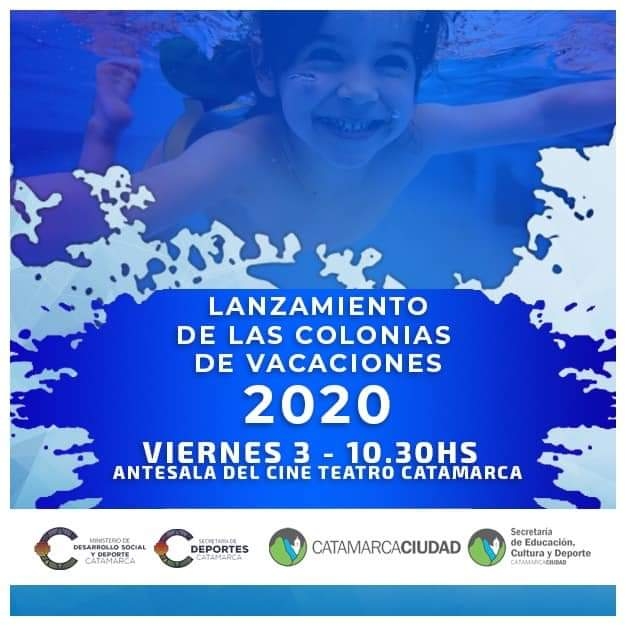 Los anuncios sobre el lanzamiento de las Colonias de Verano 2020, estarán a cargo de la secretaria de Deportes, Dra. Sylvia Jiménez, este viernes 03/Ene., a las 10.30 hs., en la Antesala del Cine teatro Catamarca en esta Capital.