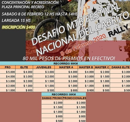 viernes, 24 de enero de 2020 00:55 viernes, 24 de enero de 2020 00:55 Categorías: 90 y 50 kilómetros. Inscripción: $400 pesos. Premios: $80 mil pesos en Premios. Organiza: Mountain Nike Recreo. Auspicia: Municipal de Recreo - Gestión Luis Polti.