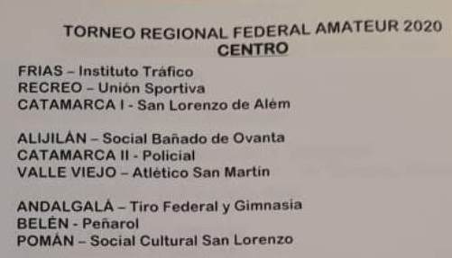 Finalmente, todos los clubes del oeste provincial : Tiro de Andalgalá, San Lorenzo de Pomán y Peñarol de Belén se cruzarán entre sí en la primera instancia del certamen.