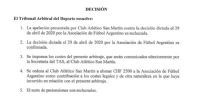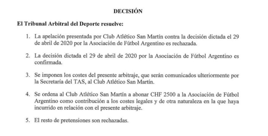 Sin embargo, el TAS explicó: "La decisión de la AFA está confirmada y los costes del presente arbitraje serán abonados por San Martín".