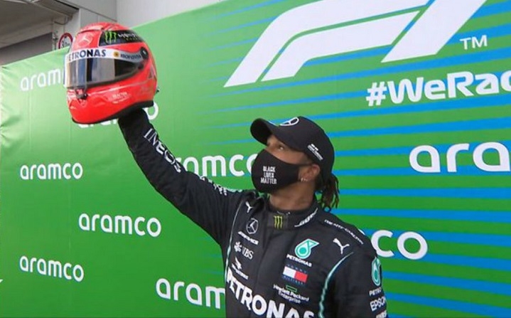 Minutos antes de la premiación oficial se vivió un momento emotivo cuando Mick Schumacher entró para darle un casco de su padre a Hamilton por haber igualado su emblemática marca.