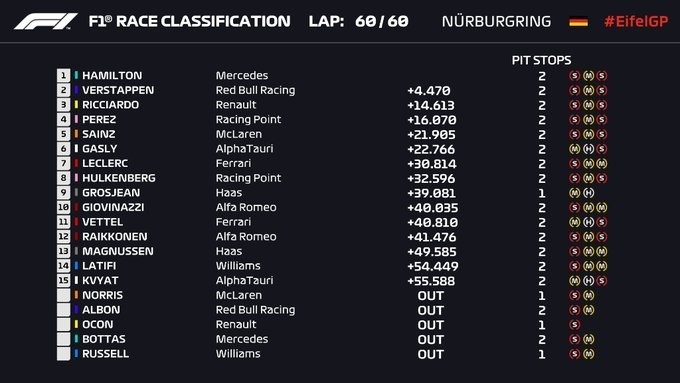 a 11ª fecha del calendario tuvo la particularidad de contar con varios abandonos que protagonizaron el mencionado Bottas, Esteban Ocon, George Russell, Alexander Albon y Lando Norris. También tuvo una destacada actuación de Nico Hulkenberg, quien reemplazó a último minuto en Racing Point a Lance Stroll y no pudo clasificar por llegar sobre la hora a la competencia. Largó en la última posición y llegó en el octavo puesto. El mexicano Checo Pérez finalizó 4° y el español Carlos Sainz llegó 5°.