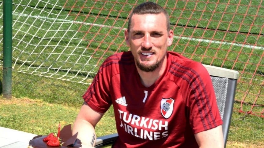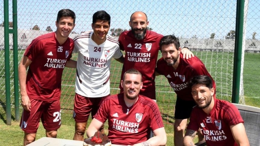 Franco Armani cumplió este viernes 34 años y el entrenamiento de River fue la ocasión justa para celebrarlo junto a sus compañeros, torta y velita incluida.