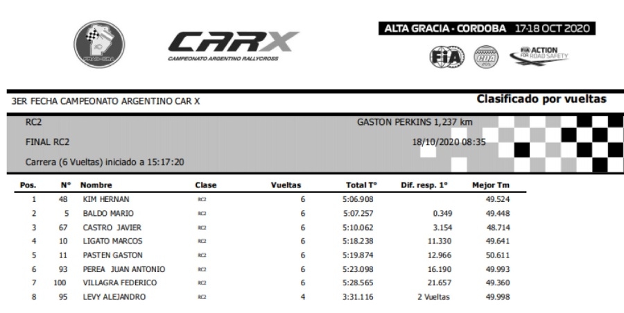 Mario Baldo lo escoltó cerrando un fin de semana en el que demostró que su nueva máquina tiene un excelente nivel para dar lucha en todas las carreras. Hoy, le faltó muy poco para anotarse el triunfo. Un tercero merecido y esforzado fue Javier Castro, que apostó al ritmo en la final, capitalizó un dibujo raro de Ligato y el retraso de Villagra para subir al podio. Ligato, Pasten, Perea, Villagra y Levy, cerraron el marcador del emotivo cierre del CARX y su paso por el Valle de Paravachasca.