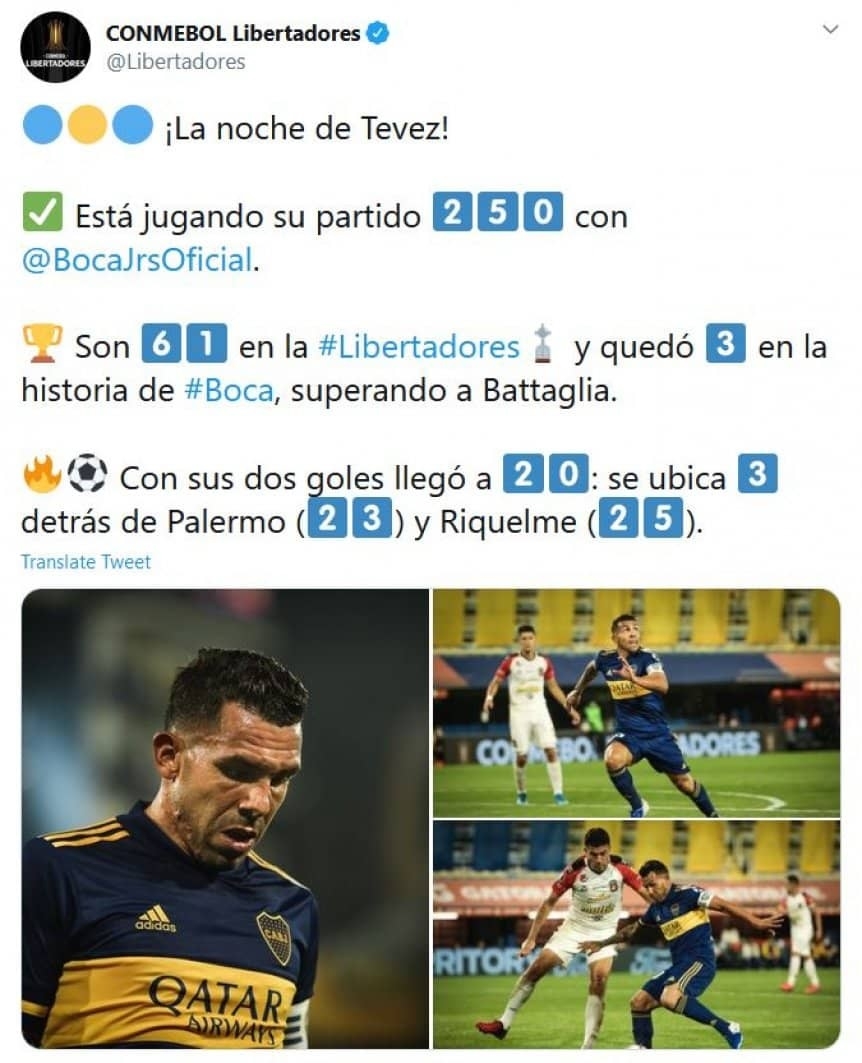 Para festejar los 250 partidos con la camiseta de Boca, Tevez convirtió el segundo y el tercero frente a Caracas para también meterse en el podio de los máximos anotadores de la historia de Boca en la Copa Libertadores.