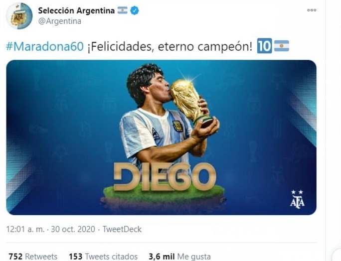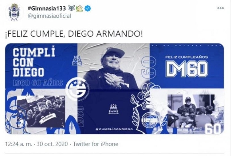 Diego Armando Maradona, astro del fútbol argentino y mundial, cumple 60 años este 30 de octubre. Apenas pasaron las 12 de la noche, varios clubes dejaron sus saludos para el Diez: Gimnasia de La Plata, Boca, Lanús, Racing y hasta la Selección Argentina.