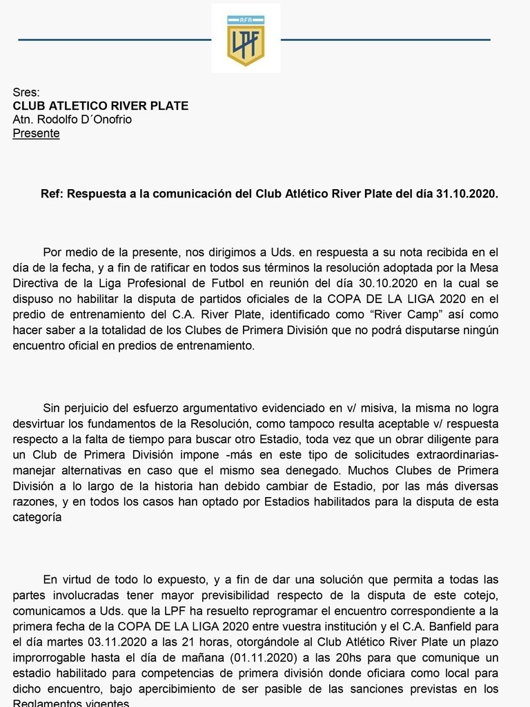 En virtud de todo lo expuesto, y a fin de dar una solución que permita a todas las partes involucradas tener mayor previsibilidad respecto de la disputa de este cotejo, comunicamos a Uds. que la LPF ha resuelto reprogramar el encuentro correspondiente a la primera fecha de la COPA DE LA LIGA 2020 entre vuestra institución y el C.A. Banfield para el día martes 03.11.2020 a las 21 horas, otorgándole al Club Atlético River Plate un plazo improrrogable hasta el día de mañana (01.11.2020) a las 20hs para que comunique un estadio habilitado para competencias de primera división donde oficiara como local para dicho encuentro, bajo apercibimiento de ser pasible de las sanciones previstas en los Reglamentos vigentes.