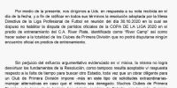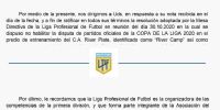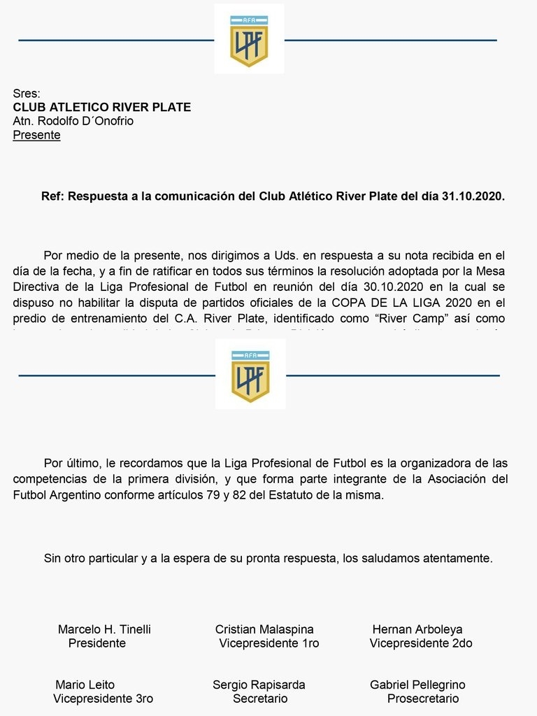 Por medio de la presente, nos dirigimos a Uds. en respuesta a su nota recibida en el día de la fecha, y a fin de ratificar en todos sus términos la resolución adoptada por la Mesa Directiva de la Liga Profesional de Futbol en reunión del día 30.10.2020 en la cual se dispuso no habilitar la disputa de partidos oficiales de la COPA DE LA LIGA 2020 en el predio de entrenamiento del C.A. River Plate, identificado como “River Camp” así como hacer saber a la totalidad de los Clubes de Primera División que no podrá disputarse ningún encuentro oficial en predios de entrenamiento.