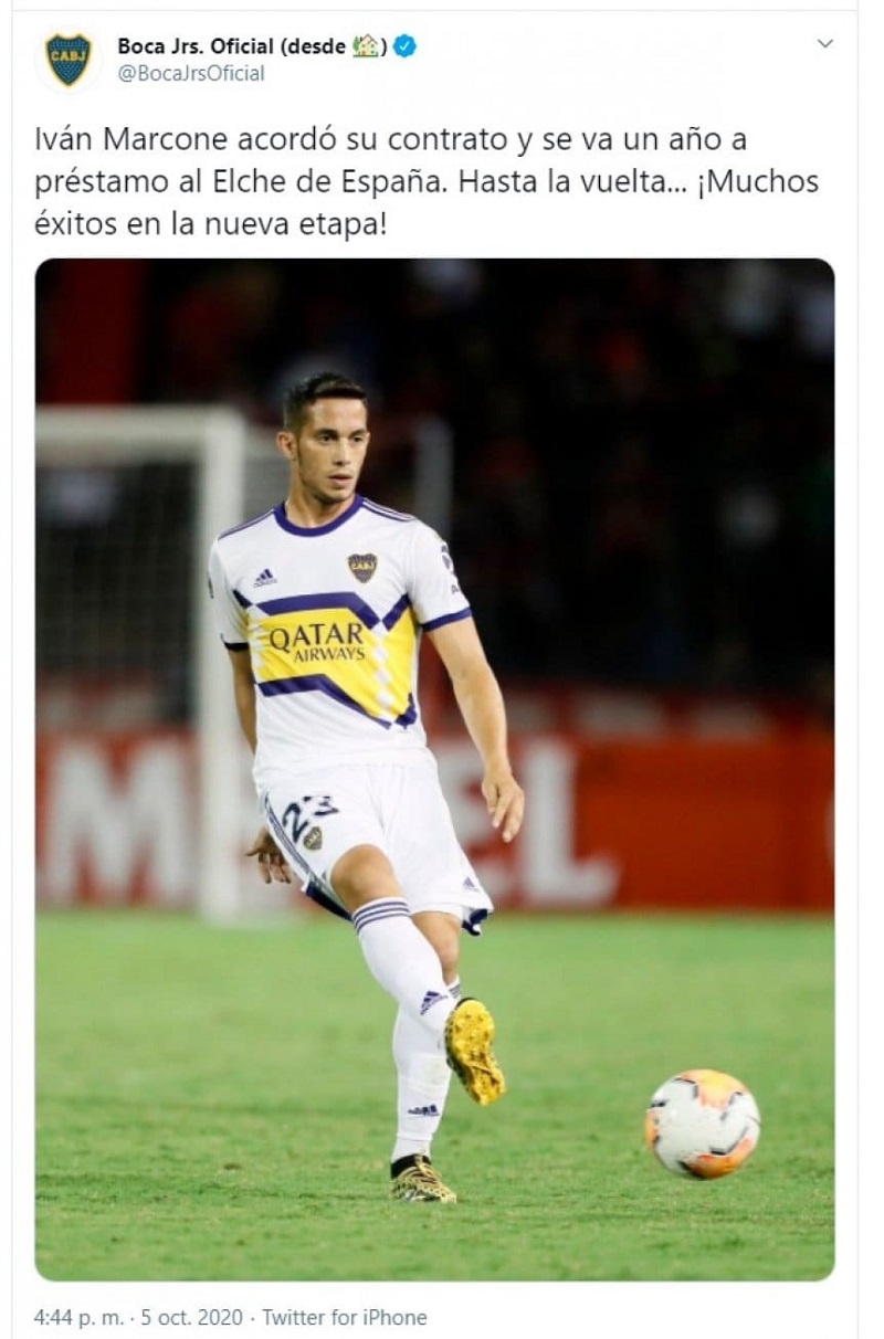 Sorpresivamente, Boca anunció de manera oficial que Iván Marcone se va del plantel de Miguel Ángel Russo para jugar hasta mitad de 2021 a préstamo en el Elche, equipo que dirige Jorge Almirón y tiene como dueño a Christian Bragarnik, el representante del mediocampista.