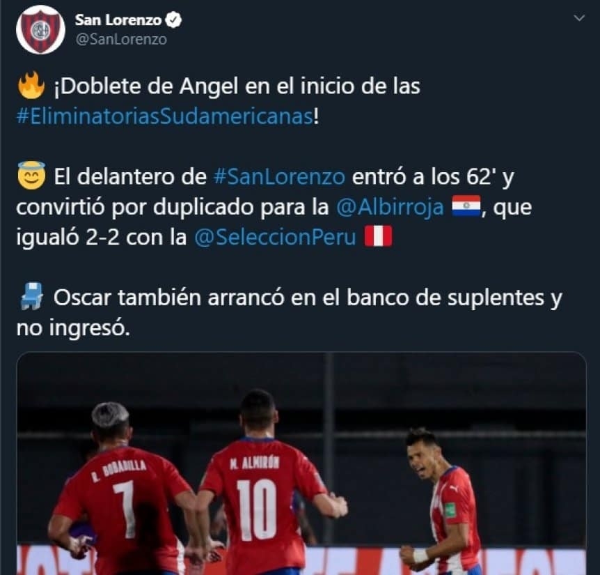 ¡Doblete de Ángel en el inicio de las Eliminatorias Sudamericanas!, escribió en sus redes San Lorenzo de Almagro.