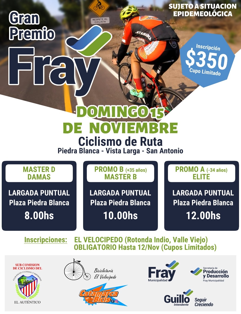 Cada categoría cuenta con un cupo limitado de inscripciones, que se están realizando en Bicicletería El Velocipedo (en inmediaciones a la rotonda del Aborigen, Valle Viejo). El monto es de $350 que cubre el seguro obligatorio. En cuanto a los premios, serán en efectivo. Sobre el circuito es el trazado de 10km, que se correrá una hora más una vuelta.
