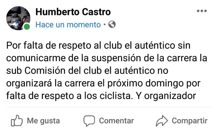Y anticipando que “el Club El Auténtico no organizará la carrera del próximo domingo, por la falta de respeto a los ciclistas”.