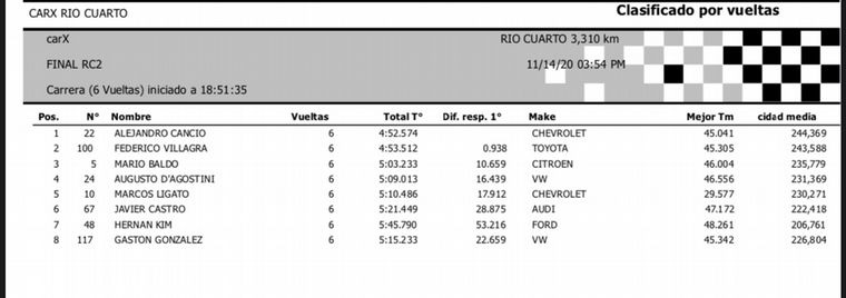 Luego de una tormenta de lluvia que prácticamente había inundado el trazado, Alejandro Cancio que se incorporó al RallyCross en esta contienda para manejar un Agile Maxi Rally del “Tango Competición”, se llevó la victoria con autoridad.