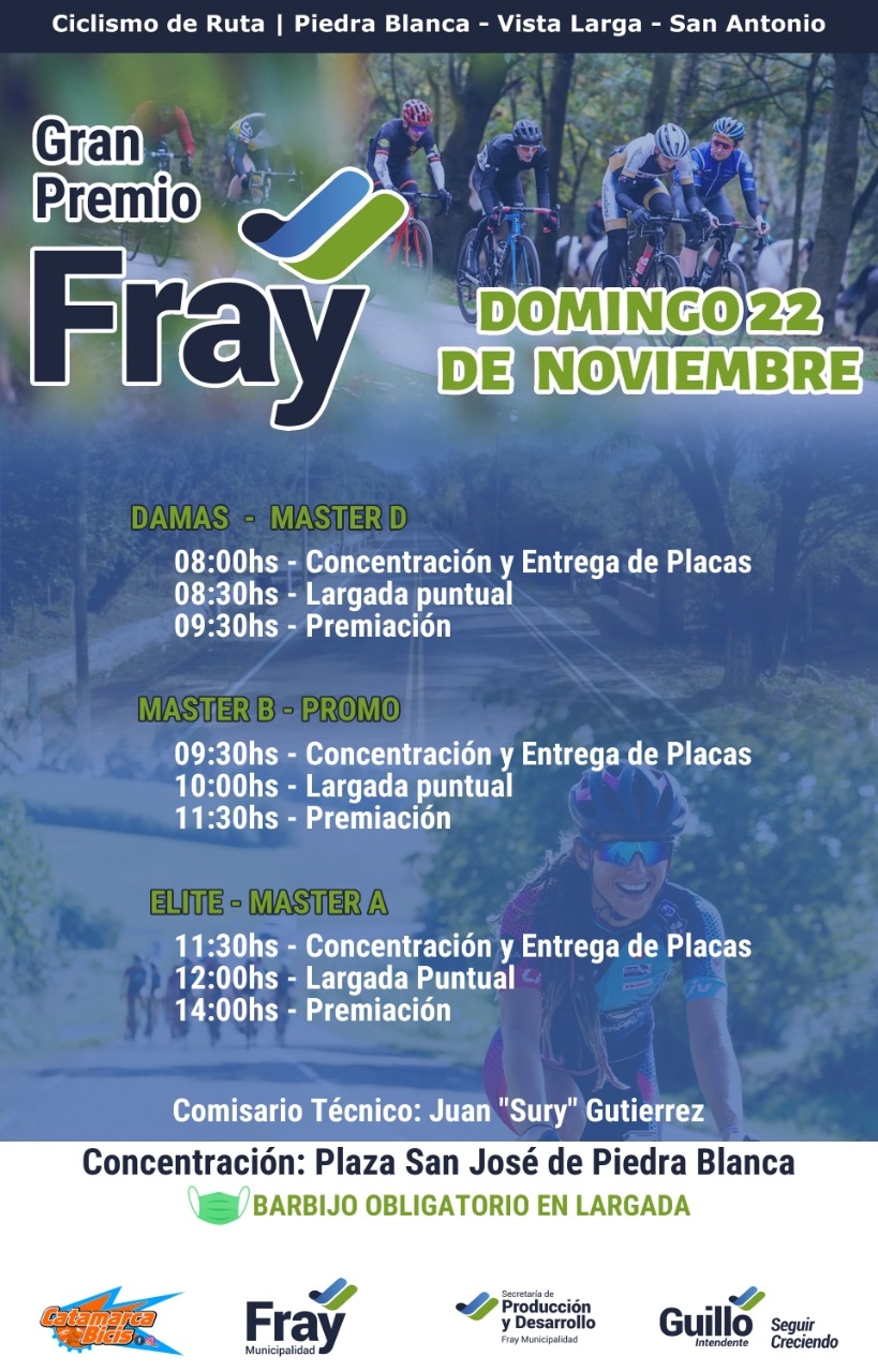 El Gran Premio Fray se pondrá en marcha a partir de las 8hs con las primeras categorías. Tendrá epicentro en la Plaza San José de Piedra Blanca, y el circuito será de 6,30km recorriendo la vista larga hasta la rotonda de “Las Lilas” en San Antonio, con cantidad de vueltas dependiendo el tiempo de carrera de cada categoría.