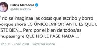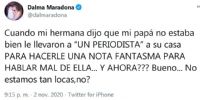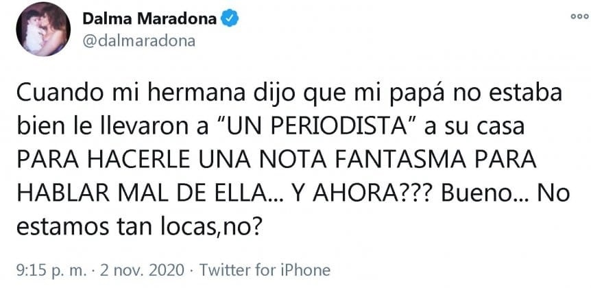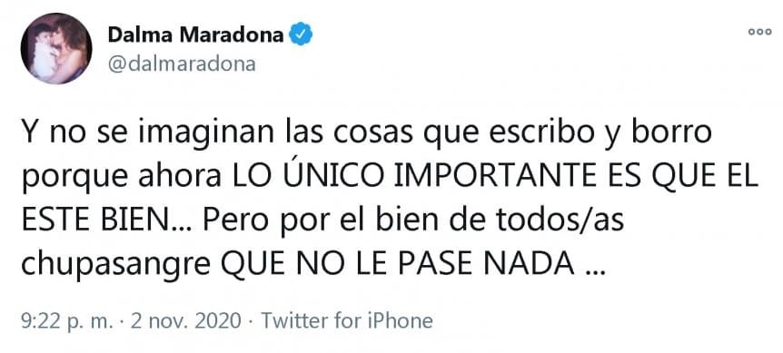 "Cuando mi hermana dijo que mi papá no estaba bien le llevaron a "un periodista" a su casa para hacerle una nota fantasma, para hablar mal de ella. ¿Y ahora? Bueno... No estamos tan locas, ¿no?", escribió primero y agregó: "Y no se imaginan las cosas que escribo y borro porque ahora lo único importante es que él esté bien... Pero por el bien de todos/as los chupasangre que no le pase nada".