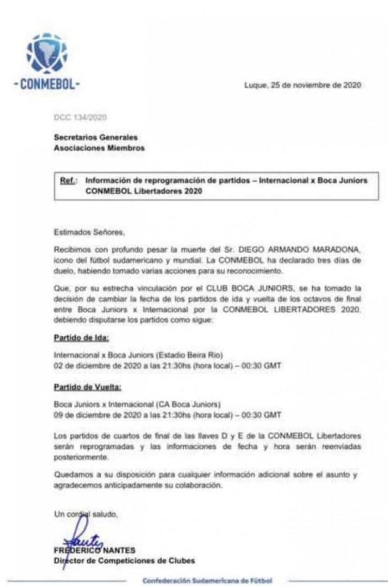 Tras el fallecimiento de Diego Maradona, a los 60 años a causa de un paro cardiorrespiratorio, el mundo del fútbol se vio conmocionado. Por esa razón, la Conmebol suspendió el partido de esta noche que iban a jugar Inter de Porto Alegre ante Boca.