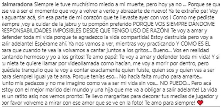 Diego Junior Maradona también le dedicó una emotiva carta a su padre a través de las redes sociales: “Papá, capitán de mi corazón, nunca vas a morir porque te amaré hasta el último respiro que voy a tener”. El hijo mayor del Diez, que comenzó a tener vínculo estrecho durante los últimos años, dejó un texto lleno de emoción: “Esperame y venime a buscar vos cuando llegue mi hora porque siempre te quise al lado mío, porque un hijo al lado de un padre no tiene miedo de nada! Buen viaje 10 de mi corazón”.