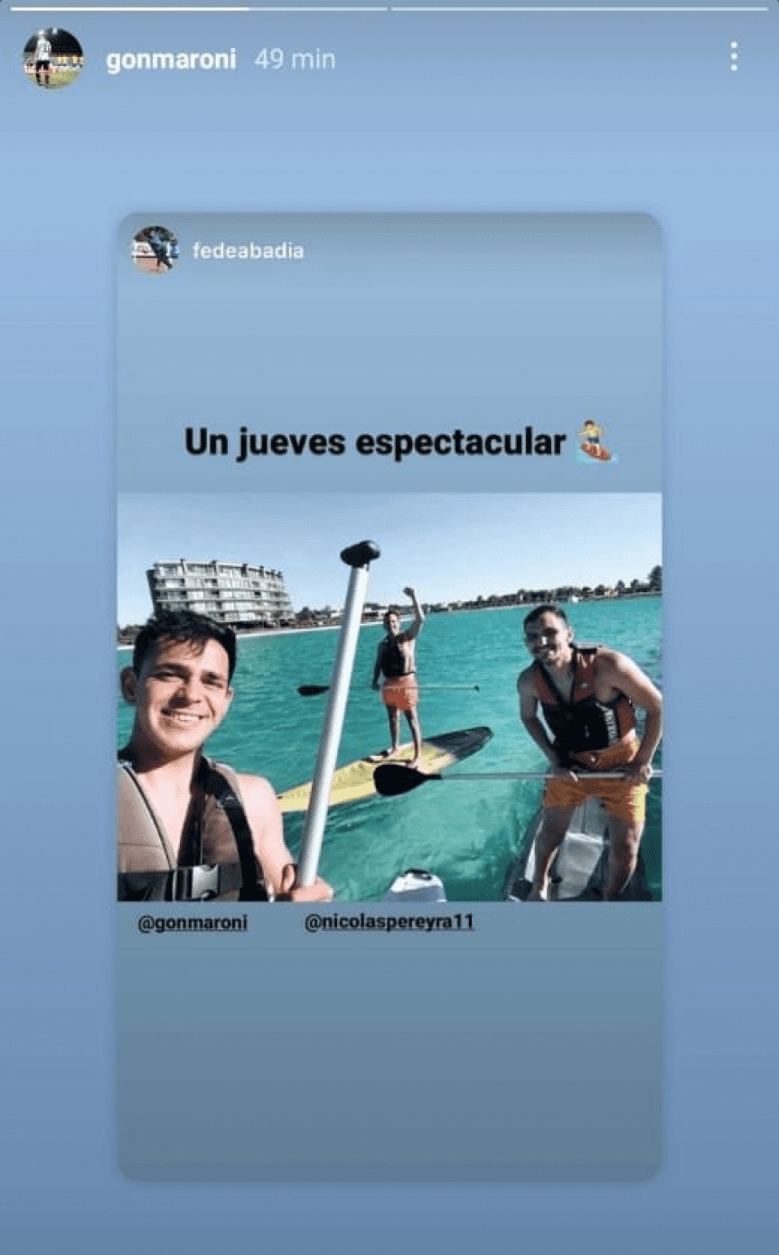 El volante reposteó una historia que había subido uno de sus amigos, en la cual decía: "Un jueves espectacular", mientras estaban en el río y a pura sonrisa. Maroni, quizás al darse cuenta lo que terminó ocurriendo, borró la foto.