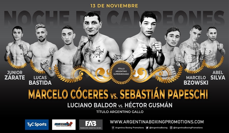El ex múltiple campeón latino y retador mundialista entrerriano Marcelo “El Terrible” Cóceres se enfrentará al ex monarca sudamericano bonaerense Sebastián “La Promesa” Papeschi, en disputa del título argentino supermediano interino, en uno de los combates estelares de la velada que se desarrollará este viernes, 13 de noviembre, en el Complejo Deportivo del Club Atlético, Social y Deportivo Camioneros, sito en Ruta de la Tradición 6300, Luis Guillón, provincia de Buenos Aires, Argentina.