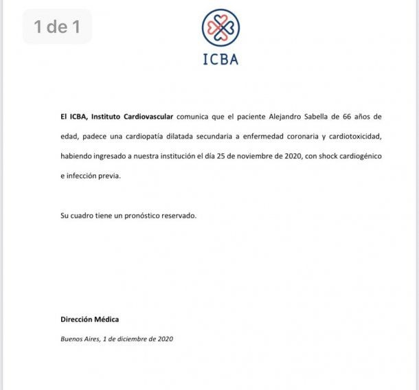 De acuerdo con el parte del Instituto Cardiovascular de Buenos Aires, el ex DT de la Selección “parece una cardiopatía dilatada secundaria a enfermedad coronaria y cardiotoxicidad”, y su cuadro “tiene un pronóstico reservado”.