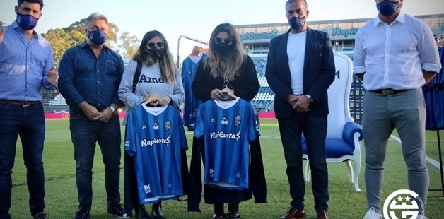 Dalma y Gianinna, en el homenaje del Lobo a Diego (prensa Gimnasia).