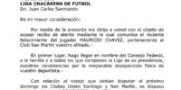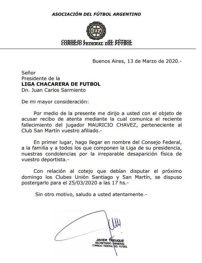 La comunicación del CF, con la firma de su secretario general Javier Treuque, después de acusar recibo de la comunicación de la Liga Chacarera sobre el deceso del futbolista Mauricio Chávez, trasmitió sus condolencias “por la irreparable desparición física de vuestro deportista”.