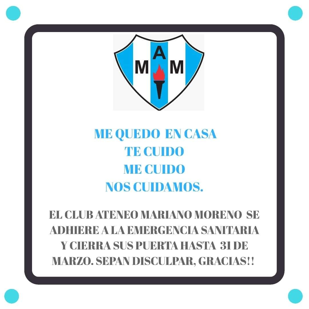Con la consigna “me quedo en casa, te cuido, me cuido, nos cuidamos…”, el Ateneo Mariano Moreno comunicó su adhesión a la Emergencia Sanitaria, y que “cierras sus puertas hasta el 31 de marzo”.