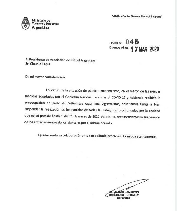 Punto final para todas las especulaciones. Por medio de un comunicado firmado por Matías Lammens, Ministro de Turismo y Deportes de la Nación, se solicita la suspensión total para el fútbol argentino de mayores en todas sus categorías, con el objetivo de preservar la salud de los futbolistas y además evitar la propagación masiva del coronavirus en territorio nacional.
