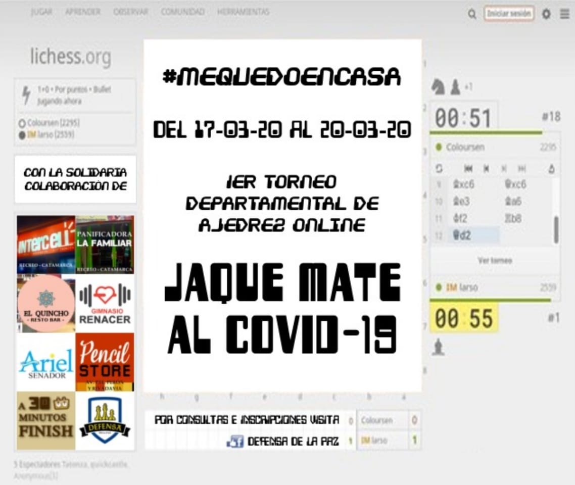 “Jaque Mate al COVID-19” es el 1° Torneo Online del departamento La Paz, bajo la modalidad blitz a 5 minutos finish, se desarrollarán seis torneos online de fase clasificatoria de 45 minutos.
