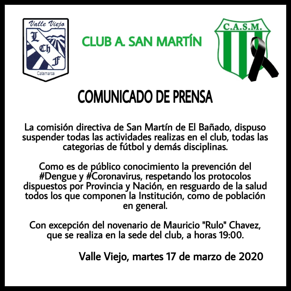 Como única excepción, y con las prevenciones del caso, solo se mantendrá el novenario por el eterno descanso del jugador Mauricio “el rulo” Chávez, recientemente fallecido, que se realiza en la sede de la calle Ramírez de Velazco, de San Isidro, Valle Viejo.