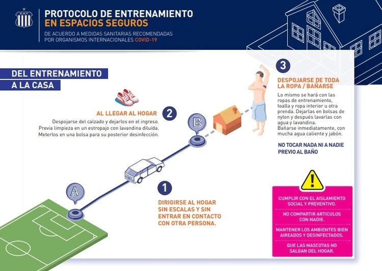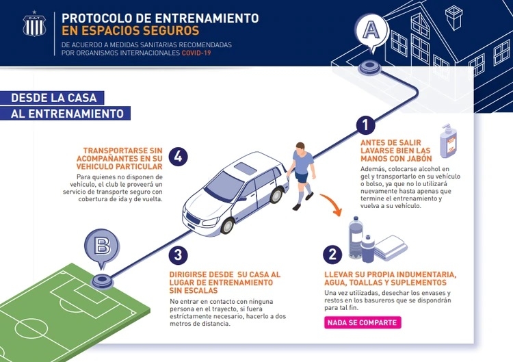 Algunos puntos importantes de la propuesta: los futbolistas deben trasladarse solos en sus propios vehículos desde sus hogares hasta el lugar de entrenamiento. En el camino no deben tener contacto con nadie y deben llevar sus elementos de uso personal (indumentaria, toallas, botellas, etcétera).