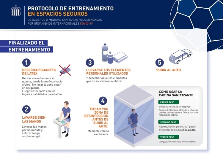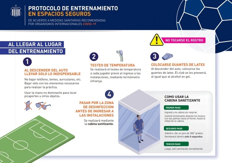 Una vez que lleguen al club, se les tomará la temperatura y deberán pasar por una cabina sanitizante, un dispositivo que elimina virus, bacterias y hongos de manera totalmente segura. El uso de guantes de látex también será obligatorio. Los entrenamientos serán siempre en espacios abiertos y en grupos de no más de cuatro personas. Se deberá respetar una distancia personal de, al menos, 20 metros.
