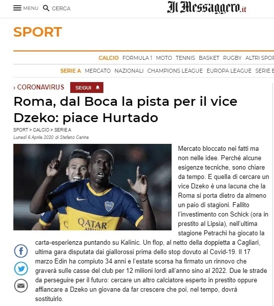 Según informó el diario italiano Il Messaggero, Daniele De Rossi habría mantenido una charla virtual con dirigentes de la Roma para que hagan un intento para contratar al joven delantero, quien le habría causado una gran impresión en su estadía en el xeneize.