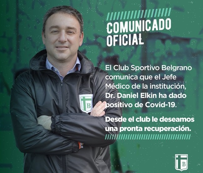 — Sportivo Belgrano (@ClubSpBelgrano) April 7, 2020 | El Club Sportivo Belgrano comunica que el Jefe Médico de la institución, Dr. Daniel Elkin ha dado positivo de Covid-19. Desde el club le deseamos una pronta recuperación. pic.twitter.com/.