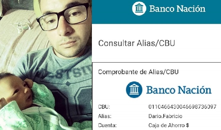Por tal motivo, los que quieran colaborar para que Darío pueda afrontar los gastos, hacerlo a su CBU de caja de ahorros en pesos, Banco Nación Argentina al N° 0110466430046698736097 o al alias Darío.