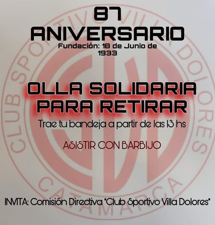 Este 18 de junio no es un día más para el Club Sportivo Villa Dolores, de Las Chacras, que hoy está cumpliendo 87 años de vida institucional y deportiva. Y la celebración también será distinta: con una olla popular y un arroz solidario.